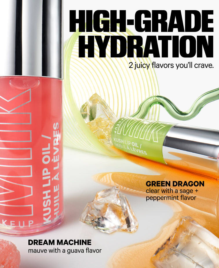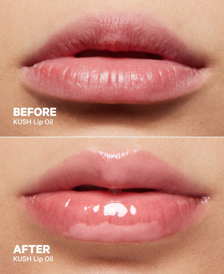 Includes two full-size KUSH Lip Oils in Green Dragon (clear with a sage and peppermint flavor) and Dream Machine (mauve with a guava flavor).