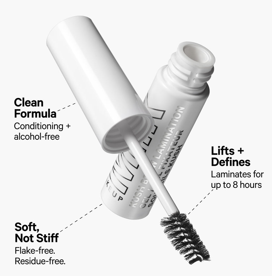 KUSH Brow Lamination Gel is best for a brushed-up laminated look and delivers lasting hold, while KUSH Clear Brow Gel gives you soft, flexible hold that’s great for shaping and setting. Both of ’em are made with conditioning ingredients, so you don’t have to worry about any residue or stiff feel. Nice.