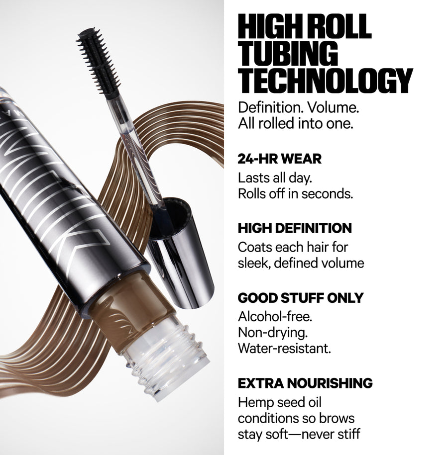 -High Roll Tubing Technology wraps each brow hair for defined volume and water-resistant wear.